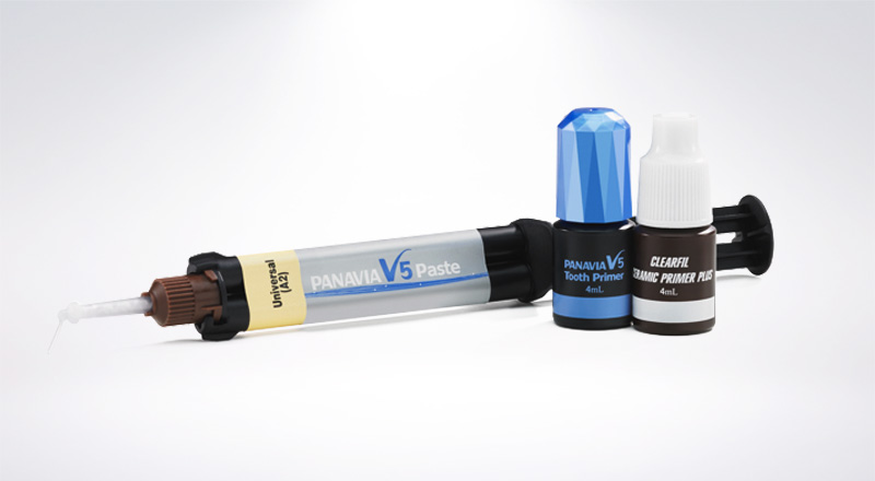 ONE SIMPLE & ESTHETIC CEMENT FOR YOUR NEEDS PANAVIA™ V5: One Simple and Esthetic Cement FOR All Your Needs! PANAVIA™ V5 is the 5th version of cement in the PANAVIA™ family. It is a true dual-cure, fluoride-releasing, color-stable, esthetic universal cement with simplified placement. PANAVIA™ V5 also provides an adhesive milestone by providing self-cure dentin bond strengths equal to a “Gold Standard” light-cure bonding agent, CLEARFIL™ SE BOND. Contents: 1 Syringe 2.4 ml (Universal (A2)) 1 Syringe 2.4 ml (Clear) 1Try-in Paste 1.8 ml (Universal (A2)) 1 Try-in Paste 1.8 ml (Clear) 1 Tooth Primer 2 ml 15 pcs. Mixing tip 1 Mixing dish