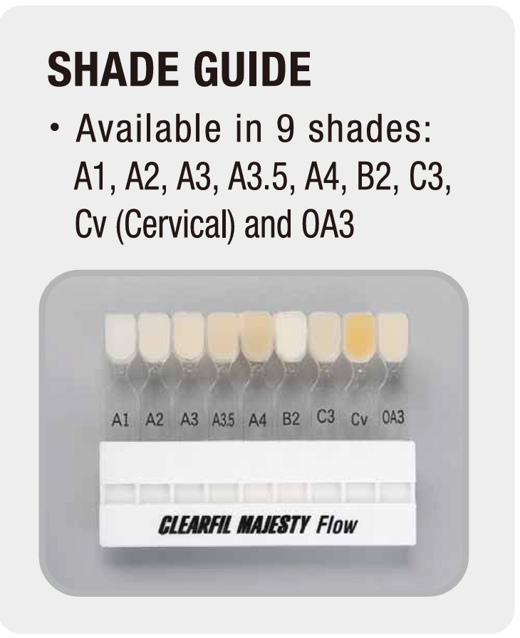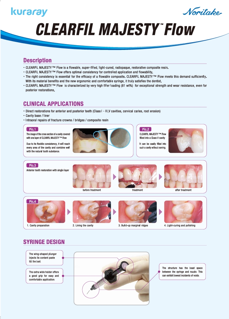 CLEARFIL MAJESTY™ Flow is a flowable, superfilled, light-cure, radiopaque restorative composite resin. The resulting resin matrix is reinforced with an extremely high filler loading of 81wt% (62vol%), a loading similar to many universal composite resins. CLEARFIL MAJESTY™ Flow has a low viscosity for good handling and easy placement, high mechanical properties (strength, wear resistance, durability), high radiopacity and very low polymerization shrinkage. These features make it a very versatile product with multiple uses including as a universal composite resin.