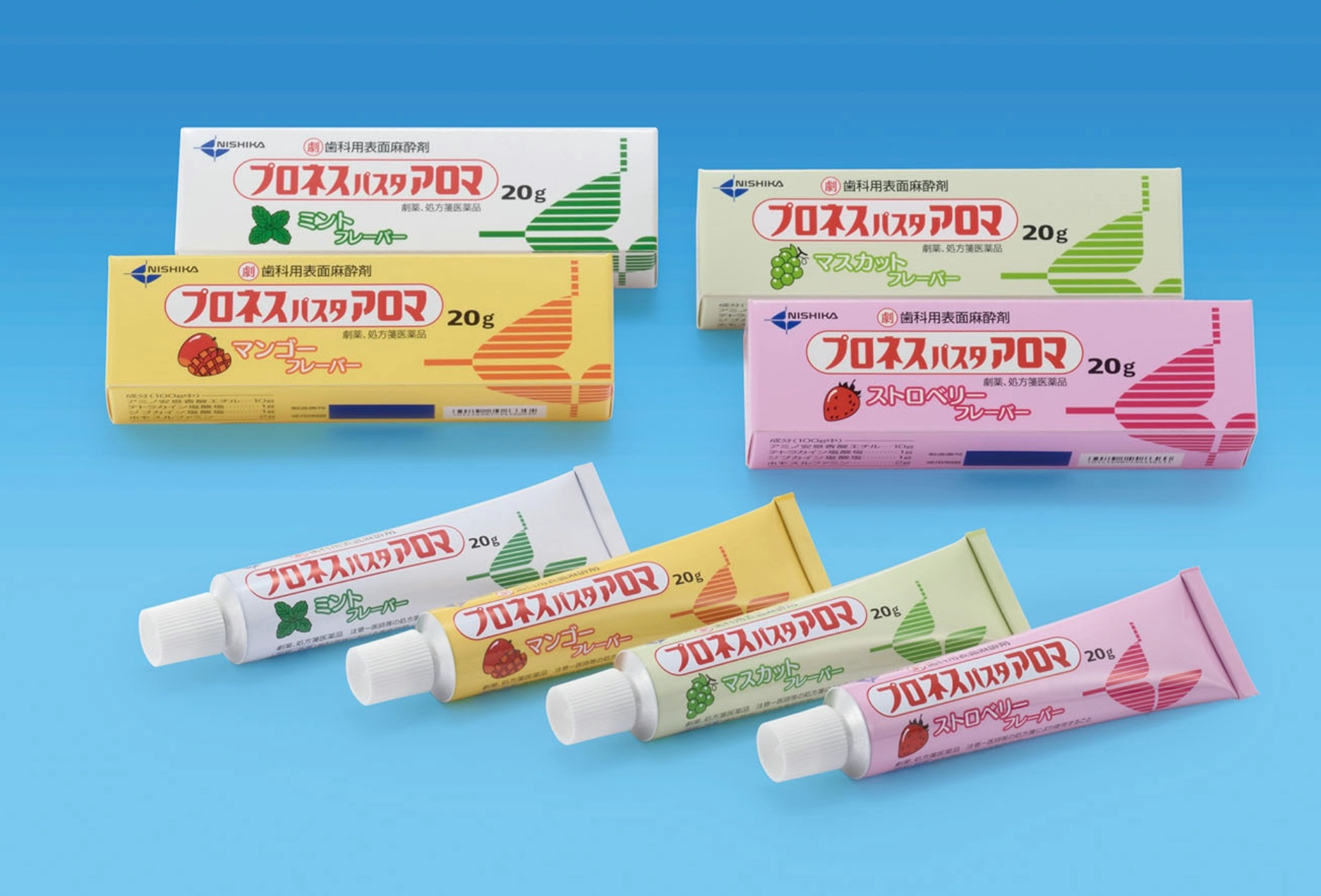 PRONES-PASTA AROMA is a topical anesthetic available in four flavors. The active ingredient is ethyl aminobenzoate known as a typical surface anesthetic. PRONES-PASTA AROMA also contains tetracaine hydrochloride and dibucaine hydrochloride with potent and long-acting anesthetic action. The antibacterial action of homosulfamine is beneficial and prevents infection at the applied area. Indications: Topical anesthesia for dental use Presentation: 20g