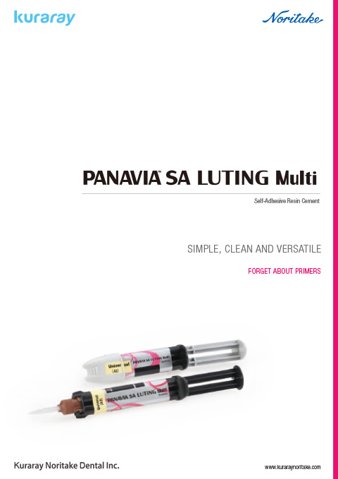 SIMPLE, CLEAN AND VERSATILE PANAVIA™ SA LUTING Multi is a dual-cure (light- and/or self-cure), fluoride releasing, radiopaque self-adhesive resin cement for ceramic (porcelain, lithium disilicate, zirconia, etc.), composite resin, and metal restorations. It has a choice of Automix delivery (equal amounts of two components are combined through a mixing tip) or Handmix (equal amount of two components are combined on a mixing pad). The features of PANAVIA™ SA LUTING Multi is SIMPLE, CLEAN AND VERSATILE thanks to MDP and LCSi monomer. The Original MDP monomer creates a strong chemical bond to Metal Alloy, Zirconia, Enamel and Dentine. The Original LCSi monomer creates a strong chemical bond to Porcelain, Lithium Disilicate and Composite Resin. New chemistry of the MDP and LCSI monomer provides high bond strength and eliminates additional steps forgetting about the primer process and additional steps for your daily needs.