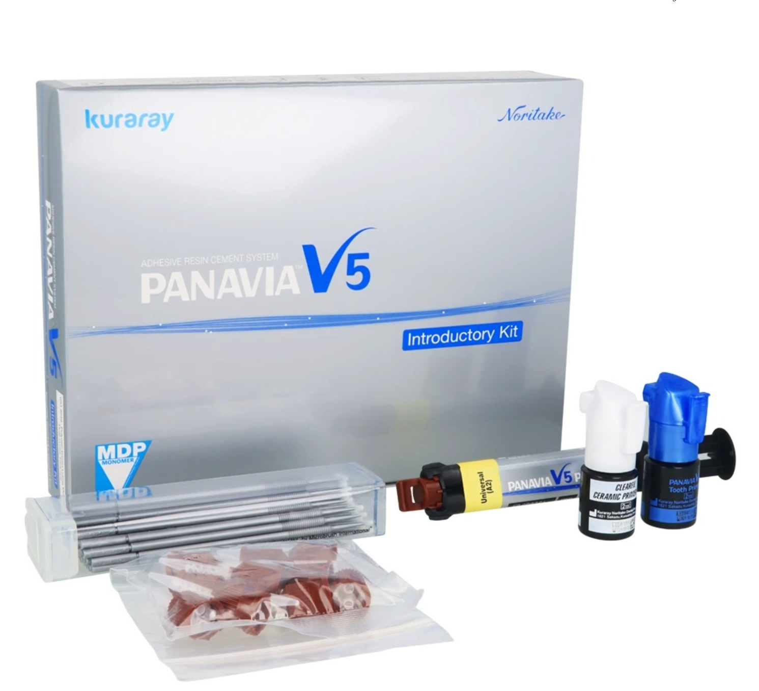 ONE SIMPLE & ESTHETIC CEMENT FOR YOUR NEEDS PANAVIA™ V5: One Simple and Esthetic Cement FOR All Your Needs! PANAVIA™ V5 is the 5th version of cement in the PANAVIA™ family. It is a true dual-cure, fluoride-releasing, color-stable, esthetic universal cement with simplified placement. PANAVIA™ V5 also provides an adhesive milestone by providing self-cure dentin bond strengths equal to a “Gold Standard” light-cure bonding agent, CLEARFIL™ SE BOND. Contents: 1 Syringe 2.4 ml 1 Tooth Primer 2 ml 1 CLEARFIL™ CERAMIC PRIMER PLUS 2 ml 10 pcs. Mixing tip 50 pcs. Applicator brushed (fine <silver>) 1 Mixing dish